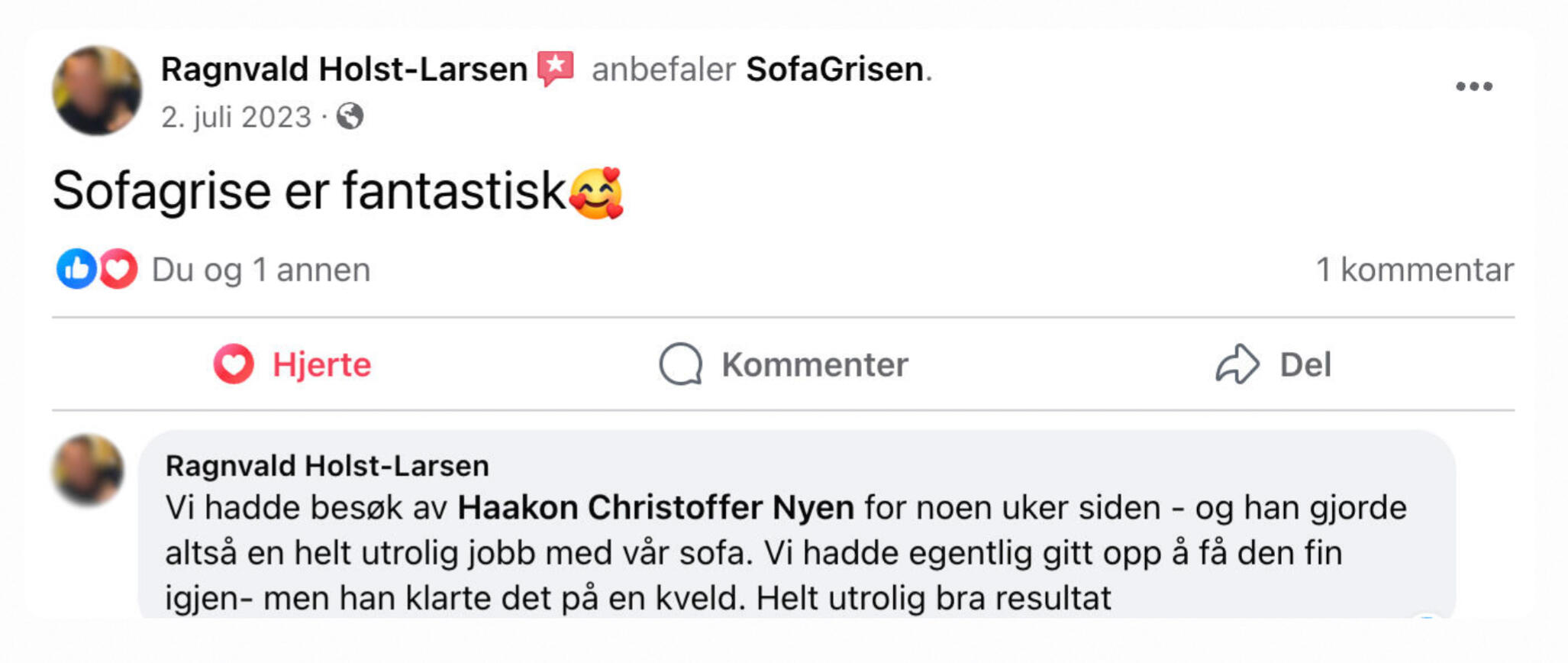 Vår erfaring med sofa-rens startet med å hente slitne sofaer som skulle kastes. Vi renset sofaene og reparerte eventuelle skader, for så å legge dem ut til salg på Finn.no til en rimelig pris. Slik lærte vi alle tips og triks for å gjenopprette en sofa til sin opprinnelige stand.Sommeren 2023 begynte vi å tilby sofa-rens hjemme hos kunder i Eidsvoll og omegn. Vi tar stor stolthet i å levere et godt resultater og god service. Bildet er fra en artikkel om vår tjeneste i EUB, publisert i oktober 2023.